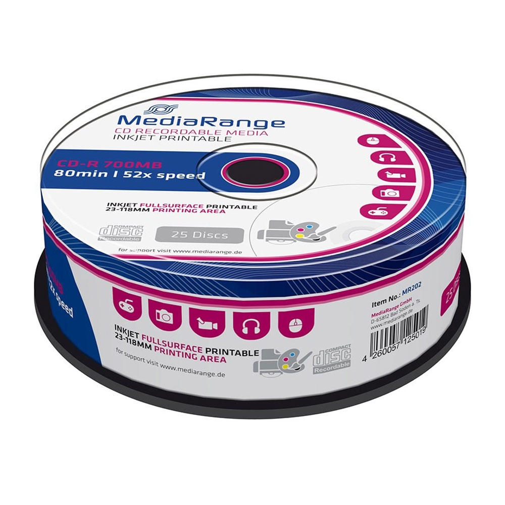 MediaRange CD-R 80′ 700MB 52x Inkjet Fullsurface Printable Cake x 25 (MR202)